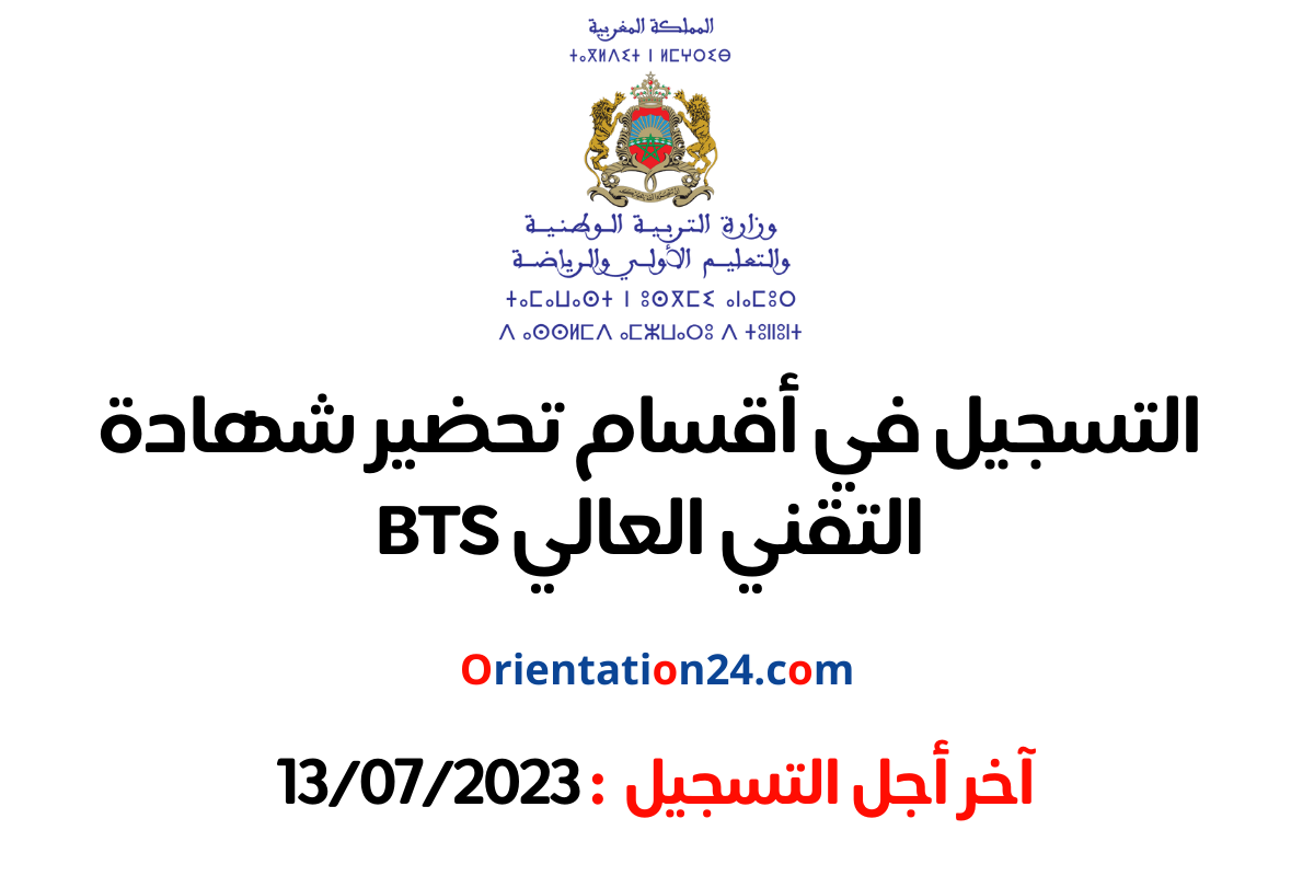Inscription Concours BTS التسجيل في أقسام تحضير شهادة التقني العالي 2023، تنهي وزارة التربية الوطنية أن الترشيح لولوج أقسام تحضير شهادة التقني العالي 2023/2022 سيتم من 21 يونيو إلى 13 يوليوز 2023.