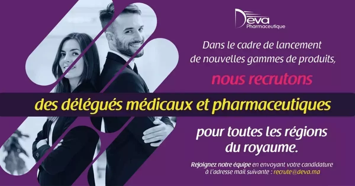 Deva Pharmaceutique, entreprise en pleine expansion, cherche à intégrer des Délégués Médicaux et Pharmaceutiques H/F expérimentés, pour couvrir le territoire marocain (Agadir, Casablanca, Fès, Marrakech, Meknès, Nador, Oujda, Rabat, Salé et Tanger).