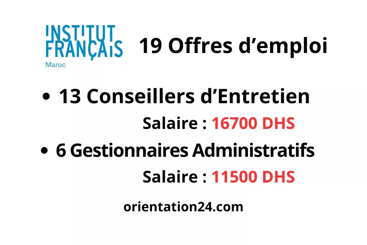 Institut Français du Maroc recrute 13 Conseillers d’Entretien Salaire 16700 Dhs sur Casablanca, Fès, Rabat et Marrakech, et 6 Gestionnaires Administratifs Salaire 11500 Dhs sur Rabat.